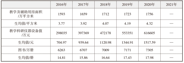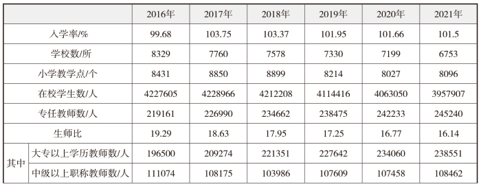 表2-2-1显示,从2018年开始,我省小学学校数量在减少,在校生数量有所减少,专任教师在逐年增加。小学在校生2020年4063050人比2019年4114416人减少了51366人,2021年3957907人比2020年减少105143人。小学专任教师数量逐年增加,全省小学生师比从2016年19.29∶1逐年降低,到2021年降低到16.14∶1,通过实施构建优质与均衡新生态诸多途径,各方面取得了较大的成绩,助推了小学教育高质量发展。