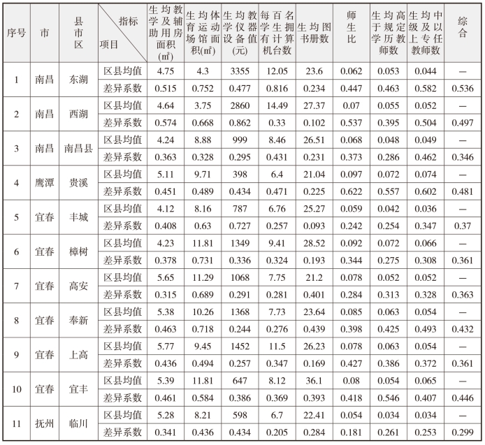 表2-3-3:江西省部分市县初中教育学校校际差异系数表