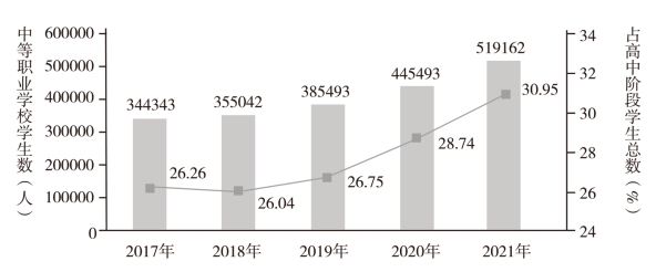 图2-4-1:江西省2017—2021年中等职业学校学生数分析图