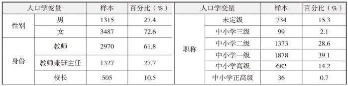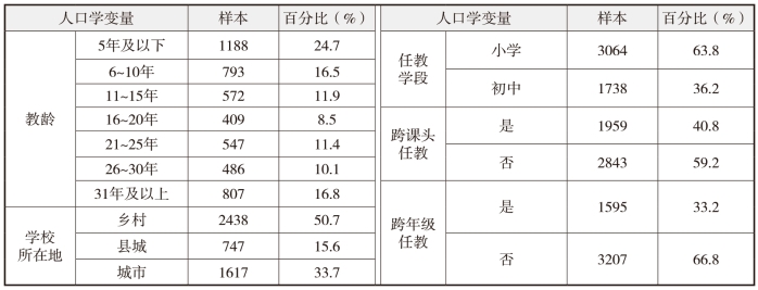 调查问卷采用问卷星形式向全省各设区市推送,共有4802名义务教育阶段校长和教师填写了问卷。其中,从身份看,教师占61.8%,教师兼班主任占27.7%,校长占10.5%;从性别看,男教师占27.4%,女教师占72.6%;从教龄看,以五年为一段,5年及以下教龄教师占比最多,近1/4(24.7%),其他各段分布比较均匀;从学段看,小学63.8%,初中36.2%;从学校所在地看,乡村占50.7%,县城占15.6%,城市占33.7%;从职称看,近15%的教师有高级职称,但也有超15%的教师未定级;从任教学科看,40.8%的教师跨课头任教,33.2%的教师跨年级任教。如表3-1-1所示。