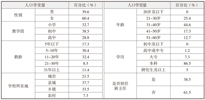 本次调研采用实地调研和问卷调查相结合的方式。实地调研择机走访了赣州市南康区唐江中学、南昌师范学院附属中学等几所学校,受新冠疫情等外在因素影响,实地调研的样本学校数量有限。问卷调查则采用问卷星的形式,对全省11个设区市共1802名中小学教师进行了调研。其中,男教师占39.6%,女教师占60.4%;从年龄来看,20岁及以下的无,21~30岁的占25.4%,31~40岁的占44.6%,41~50岁的占17.3%,51~60岁的占12.7%;从教龄看,5年以下教龄的教师占17.3%,5~10年和11~20年教龄的教师分别占30.4%、32.4%,21年及以上教龄的教师占19.9%;从最高学历看,无初中及以下学历的教师,高中或中专学历的教师占1.2%,大专学历的教师占7.3%,本科学历的教师占86.5%,硕士研究生及以上学历的教师占5%。调研教师中,38.5%的教师担任班主任,61.5%的教师未担任班主任;从所教授的学段来看,小学占32.7%,初中占38.5%,高中占28.8%;从教师工作的学校所在地看,县以上城市占21.5%,县城占37.7%,乡镇占33.5%,农村占7.3%。如表3-2-1所示。