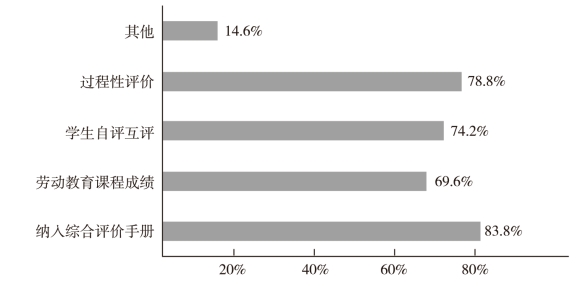 2020年教育部印发的《大中小学劳动教育指导纲要(试行)》(教材〔2020〕4号)指出:要将劳动素养纳入学生综合素质评价体系。以劳动教育目标、内容要求为依据,将过程性评价和结果性评价结合起来,健全和完善学生劳动素养评价标准、程序和方法,鼓励、支持各地利用大数据、云平台、物联网等现代信息技术手段,开展劳动教育过程监测与记实评价,发挥评价的育人导向和反馈改进功能。调查数据显示:对中小学生劳动教育进行评价的主体,80.4%的选择学校,83.8%的选择教师,81.5%的选择学生。通过这些数据可知,在学校中,教师是对劳动教育表现的主要评价者,然后就是学生和学校,学生对于评价的参与度非常高,这也是对《大中小学劳动教育指导纲要(试行)》中评价内涵的较好落实。除此之外,数据还显示教师对学生劳动教育的评价方式日益多元化,使用最多的三种评价方式依次为:83.8%纳入综合评价手册,78.8%采用过程性评价,74.2%采用学生自评互评的方式进行评价。如图3-2-4所示。
