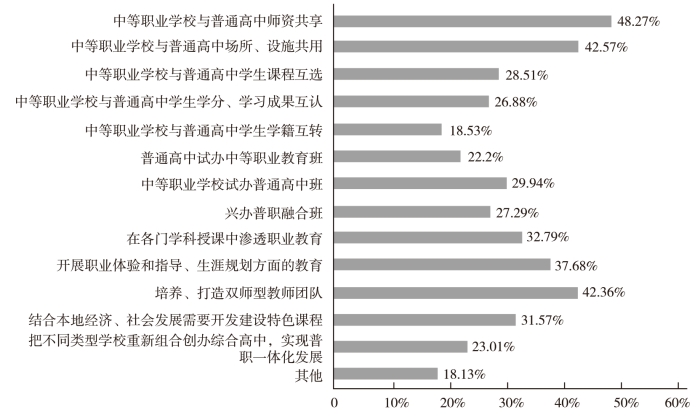 通过上图可见,选择比例超过40%的为中等职业学校与普通高中师资共享(48.27%),中等职业学校与普通高中场所、设施共用(42.57%),培养、打造双师型教师团队(42.36%)。这从一个侧面反映出在普职融合的模式中合作办学模式和建设综合高中模式是比较受欢迎的。选择比例在30%以上、40%以下的是开展职业体验和指导、生涯规划方面的教育(37.68%),在各门学科授课中渗透职业教育(32.79%),结合本地经济、社会发展需要开发建设特色课程(31.57%)。这些措施学校可以自主,实施起来还是比较方便的,所以选择的比例也较高。而课程互选、学分和成果互认、学籍互转、兴办普职融合班、学校合并成综合高中等措施牵涉的各方面因素较多,实施难度较大,所以采用相对较少。