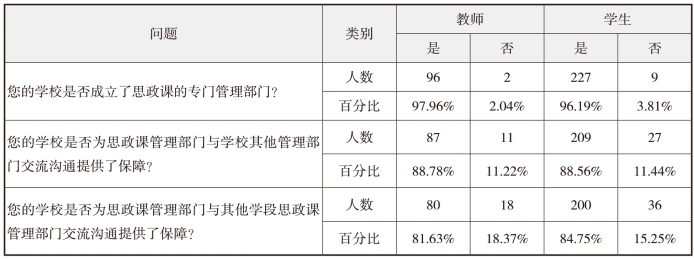 本部分设计了5个问题,目的在于全面把握我省中小学思政课在各学段的职责分工、责任认定、协调机制以及相互衔接情况。调查结果显示:关于是否成立了专门的思政课管理部门的问题,有2.04%的教师和3.81%的学生认为学校还未成立思政课专门管理部门。关于是否为思政课建设管理部门与学校其他管理部门经验交流提供保障的问题,有11.22%的教师和11.44%的学生认为学校没有为思政课建设管理部门与学校其他管理部门经验交流提供保障。关于是否为思政课建设管理部门与其他学段思政课建设管理部门经验交流提供保障的问题,有18.37%的教师和15.25%的学生认为学校没有为思政课建设管理部门与其他学段思政课建设管理部门经验交流提供保障。数据表明,学校对思政课建设的重视程度有待提高。