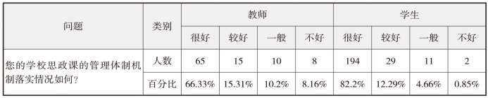 关于对学校思政课建设管理体制机制评价的问题,18.36%的教师和5.51%的学生认为学校的思政课建设管理体制机制一般或不好。数据表明,学校对思政课建设的管理体制机制还有待优化、完善。