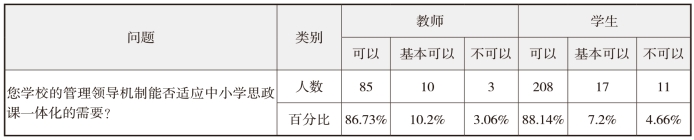 关于对学校的管理领导机制能否适应中小学思政课一体化的需要的问题,有3.06%的教师和4.66%的学生认为目前学校的管理领导机制还不能较好地适应中小学思政课建设一体化需要。数据表明,在推进我省中小学思政课一体化建设进程中,需要进一步加强中小学的管理领导机制建设。