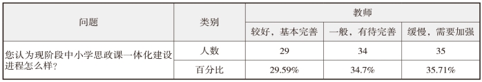关于“您认为现阶段中小学思政课一体化建设进程怎么样”的问题,有29.59%的受访教师选择“较好,基本完善”,34.7%的受访教师选择“一般,有待完善”,35.71%的受访教师选择“缓慢,需要加强”。数据表明,大多数中小学教师对我省中小学思政课一体化建设进程是不满意的,应该在今后工作中予以加强。
