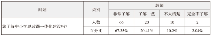 从对教师的调查中得知:关于“您了解中小学思政课一体化建设吗”的问题,67.35%的受访教师选择“非常了解”,20.41%的受访教师选择“了解一些”,10.2%的受访教师选择“不太清楚”,2.04%的受访教师选择“完全不了解”。数据表明,我省大多数中小学教师了解思政课一体化建设。