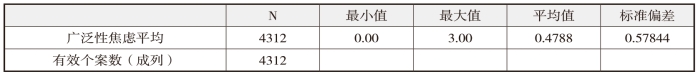 此次测量小学生的焦虑水平(0~3,0代表“从未”,3代表“总是”),得分越高,焦虑程度越高。总体来说,小学生群体的焦虑程度是低的,均值为0.48分,最高为3分,最低为0分。描述统计的结果如下表所示。