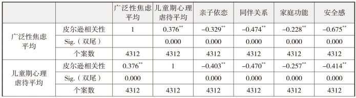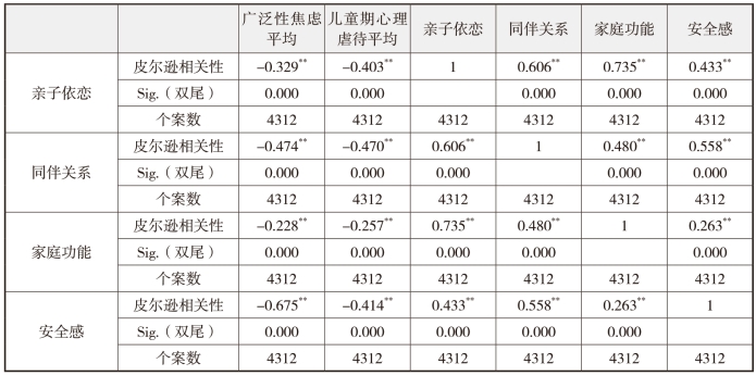 对广泛性焦虑、儿童期心理虐待、亲子依恋、同伴关系、家庭功能、安全感进行皮尔逊积差相关分析,结果如下表所示。焦虑与儿童期心理虐待呈显著正相关(r=0.38,p<0.001),小学生经历儿童期心理虐待越多,焦虑水平越高;焦虑与亲子依恋呈显著负相关(r=-0.33,p<0.001),亲子依恋程度越高,焦虑水平越低;焦虑与同伴关系呈显著负相关(r=-0.48,p<0.001),同伴关系越好,焦虑水平越低;焦虑与家庭功能呈显著负相关(r=-0.23,p<0.001),家庭功能越好,焦虑水平越低;焦虑与心理安全感呈显著负相关(r=-0.68,p<0.001),心理安全感越多,焦虑水平越低。