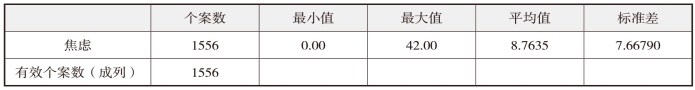 此次测量高中生的焦虑(0~3,0代表“不符合”,3代表“最符合”或“总是符合”),得分越高,焦虑水平越高。同学们的焦虑总体上处于正常水平,平均分为8.76分,最高分42分,最低分0分。描述统计结果如下表所示。
