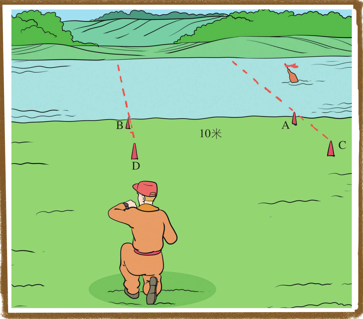 当浮标漂到CA的延长线上时,乙抬起手臂,发出计时的信号,甲开始计时,等浮标漂到DB的延长线上时,可以算出经过的时间。