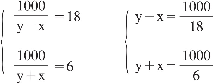 假设逆流划船的时候用的时间是18分钟,而顺流的时候是6分钟,那么就可以用下面的方程来计算出水流的速度。这里,x表示水流的速度,y表示水流不动时划船的速度。
