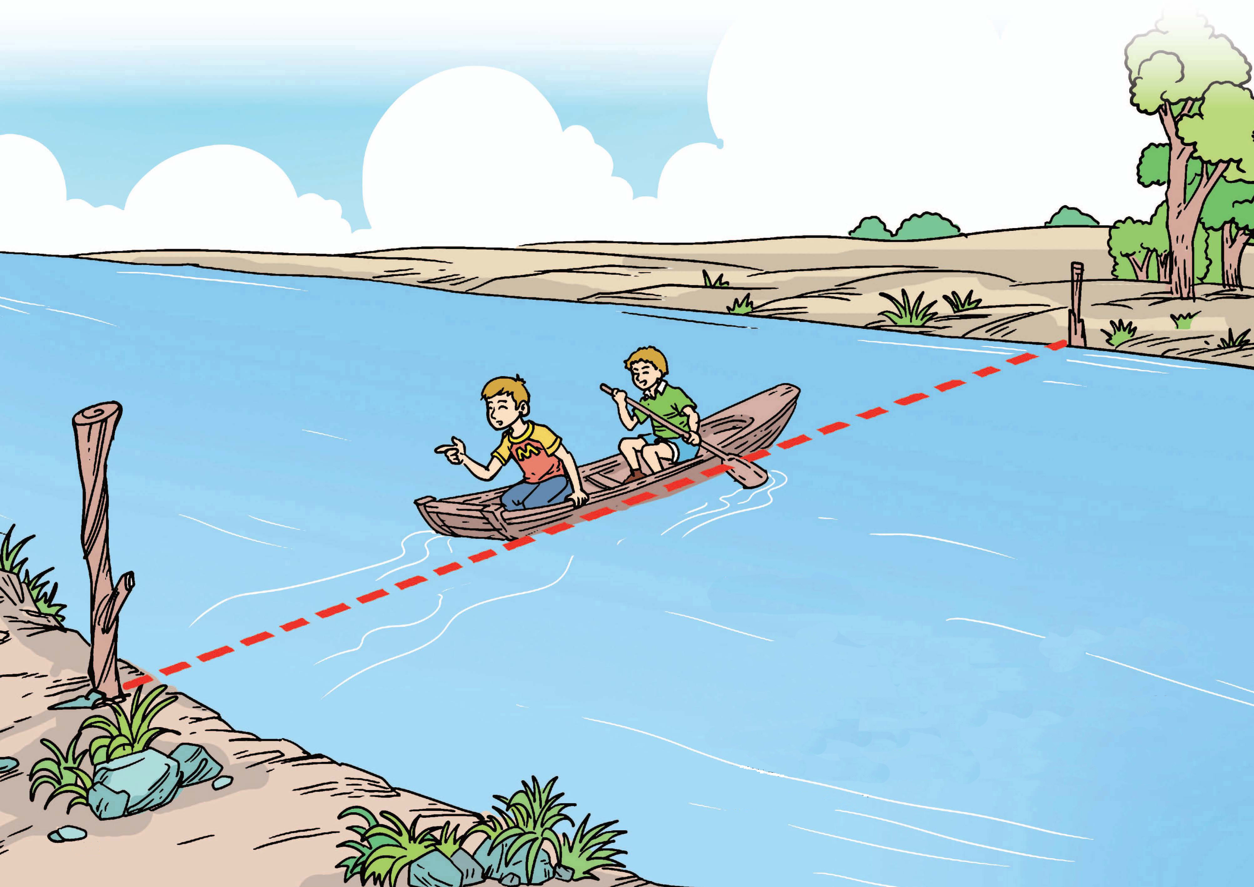 找一个可以测量出河面宽度的地方,在河的两岸,紧贴河面的岸边,分别钉两个小木桩作为标记,然后跟另一个人乘坐一条小船,从其中一个标记向另一个标记前进。需要注意的是,在划船的过程中,一定要尽量使小船始终沿着两个标记间的直线前进。