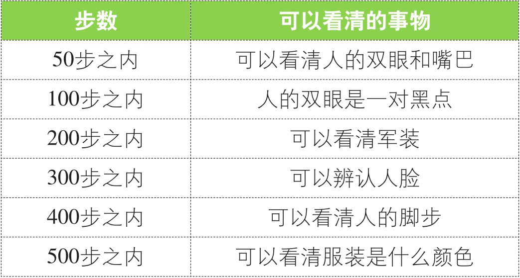 判断目测距离,可以根据不同距离上物体的清晰程度,也可以根据眼睛的习惯,在100~200步内,距离越远,物体就会显得越小。