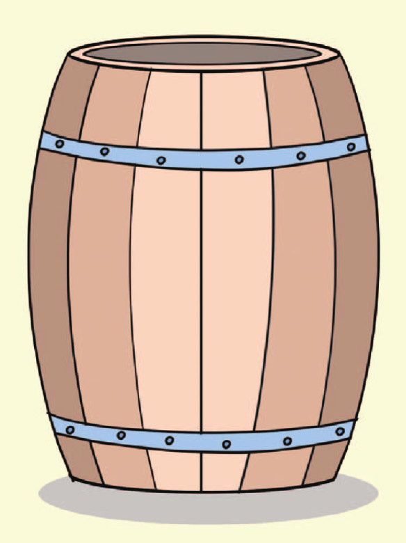 要想计算出大桶里水的容量,首先要知道桶有多高(实际上,桶里的水只有半桶)。然后还要知道水桶底部或者水桶顶部圆周的长度,以及水桶中间截面圆周的长度,也就是水桶中间最粗的地方的圆周长度。知道了这3个数值,利用几何学知识,就可以计算出水桶中的水到底有多少了。