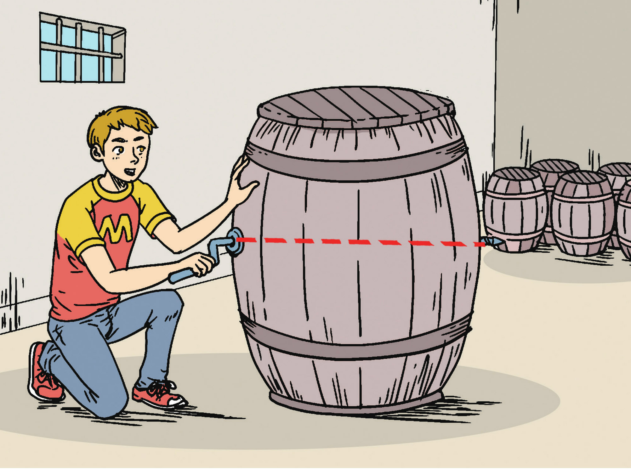在确定要测量出大桶里水的容量时,我好像突然想到了什么,而且那就是我现在需要的东西。我想,应该是一根可以通过水桶最粗地方的长度的木棍,它能帮助我测量出我想要的数据。如果有这样一根木棍,我就可以把它放到桶中,把木棍的两头抵在桶壁上。这样我就可以测量出水桶的直径,然后把它乘以3,得到周长。虽然测量和计算并不精确,但是对于现在的情况来说,已经够用了。