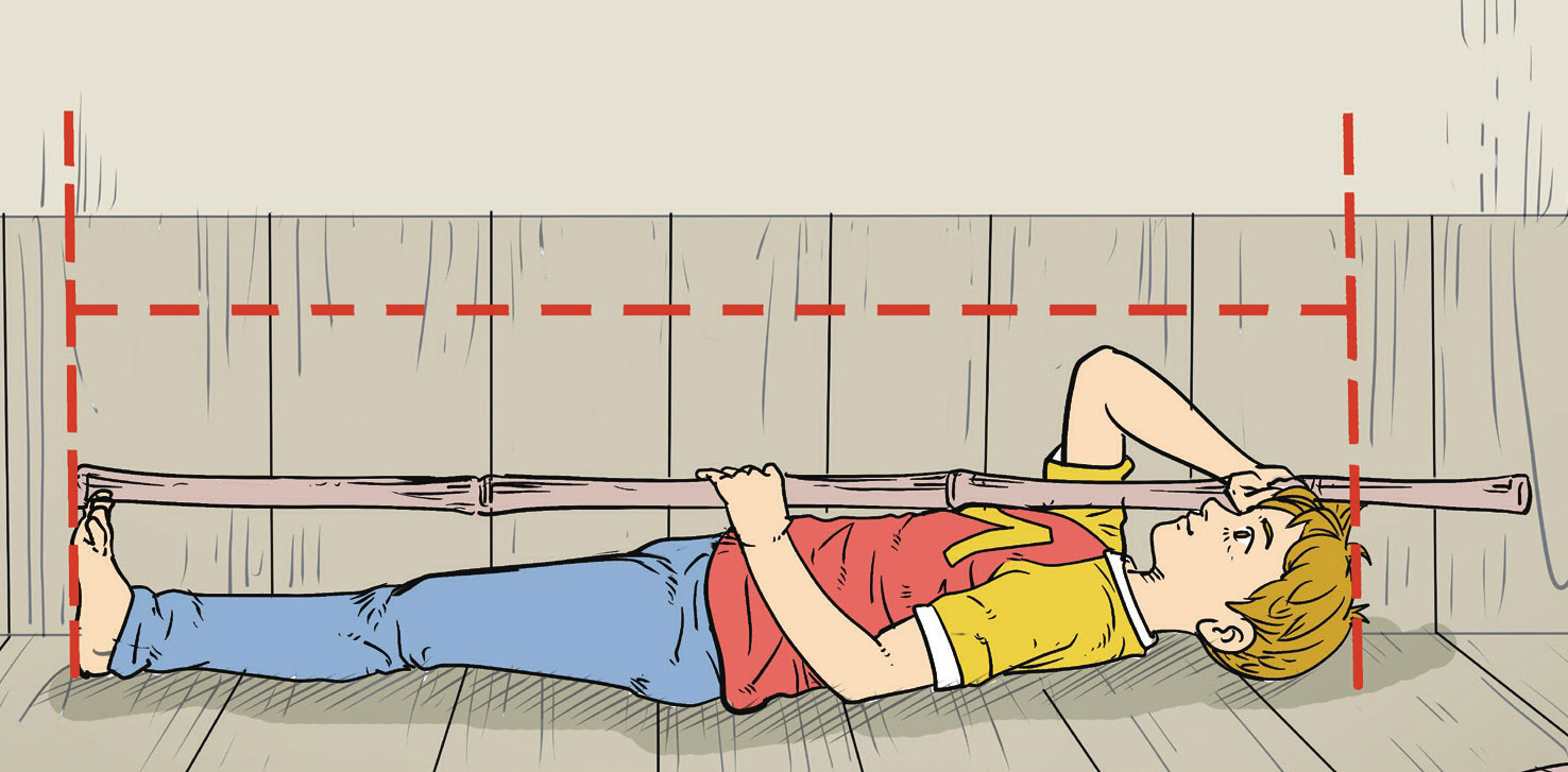 我在地板上把身体挺直,然后把长木棍的一端放到脚尖的前面,另一端贴在额头上,用一只手扶住长木棍,另一只手放在正对我头顶的地方,在长木棍上做了一个标记。就这样,我标记了自己的身高。