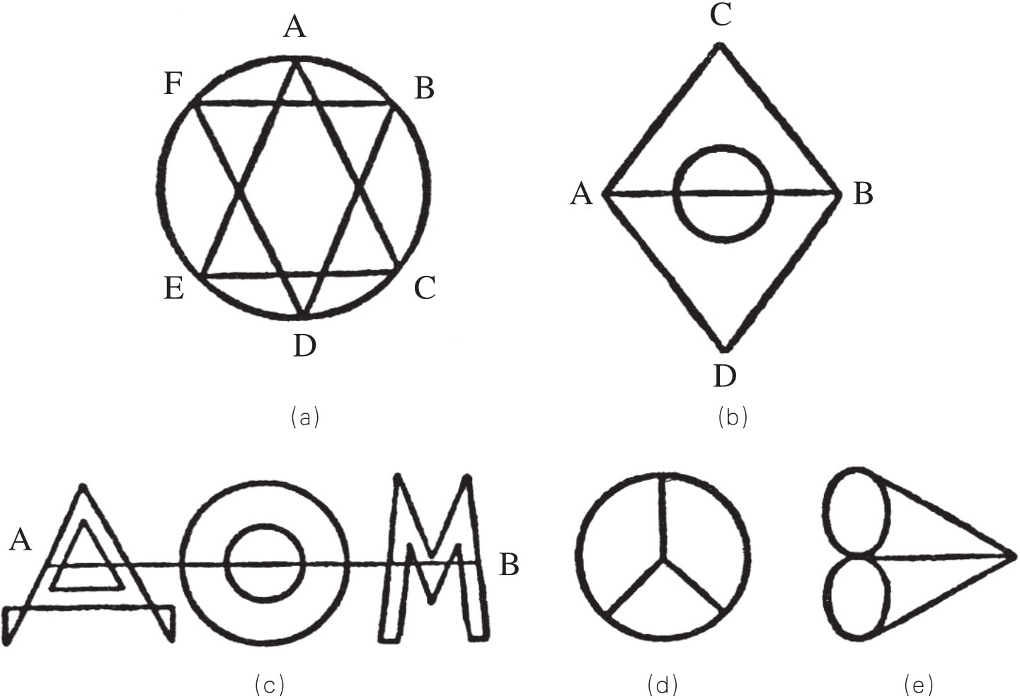 问题 如图33所示,有5个图形。现在要把它们画到一张白纸上面,要求每一个图形只能用一笔画下来。也就是说,在画的过程中,铅笔不能离开白纸,而且已经画过的地方不能再画第二遍。