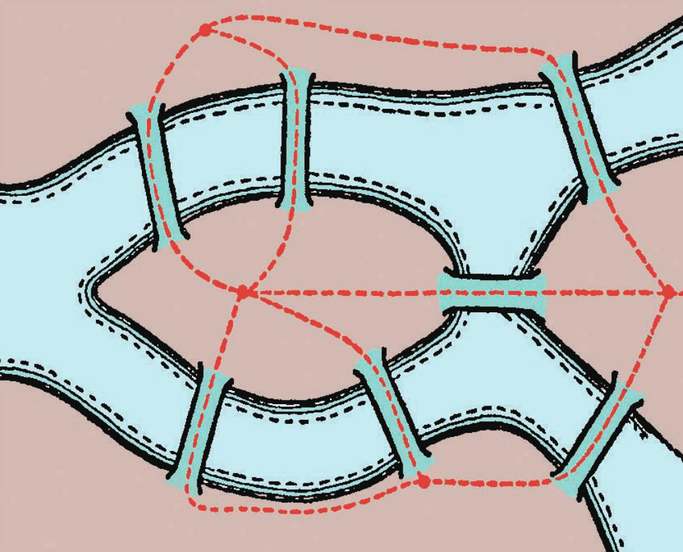 如图35中的虚线所示,我们先把可能的路径画出来,结果得到的图形跟图33中的(e)相同,它有4个奇结点。根据前面的分析,我们知道,这个图形是不可能用一笔画出来的,也就是说,通过这7座桥梁的时候,如果每座桥只能通过一次,是不可能实现的。当时,欧拉在发现这一问题后,还把它证明了出来。