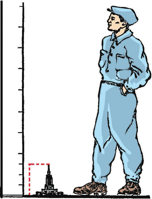 我们不妨这么设想一下,假设你自己是一个伤寒杆菌,那么如果把你放大1000倍,你的身高将是1700米,这时候,你的头部已经伸出了云层,很多摩天大楼还不到你膝盖的高度,如图40所示。这里的对比,就是伤寒杆菌放大前后的差异。