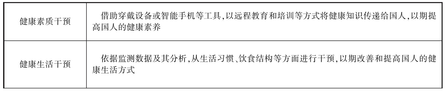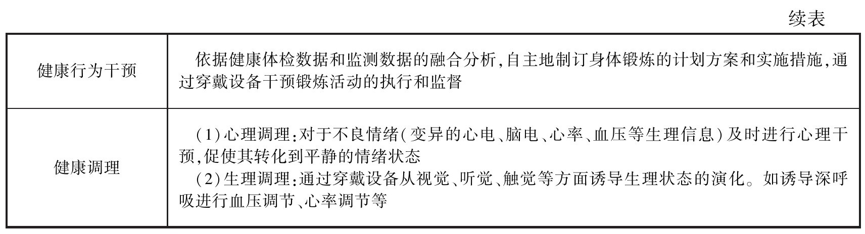 ①实时自我测量。随时随地进行生理指标、睡眠情况、日常活动、饮食习惯、周围环境等健康信息的监测,为健康管理提供长效的监测数据,便于健康状态精确评估、健康风险及时分析和预警。