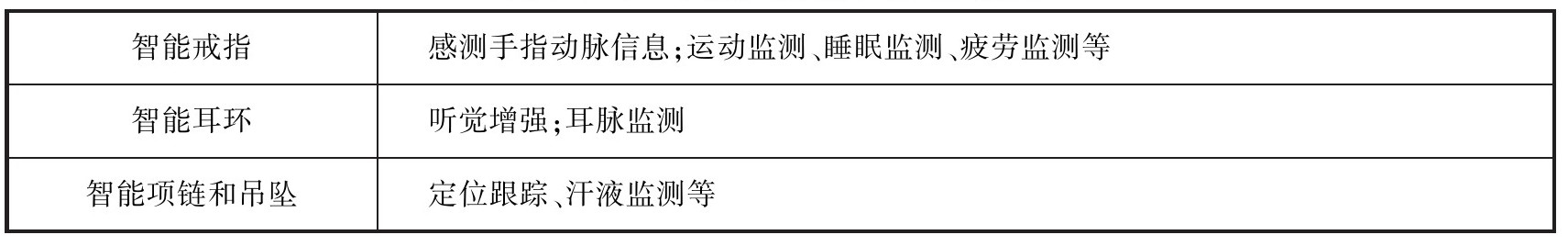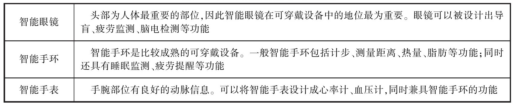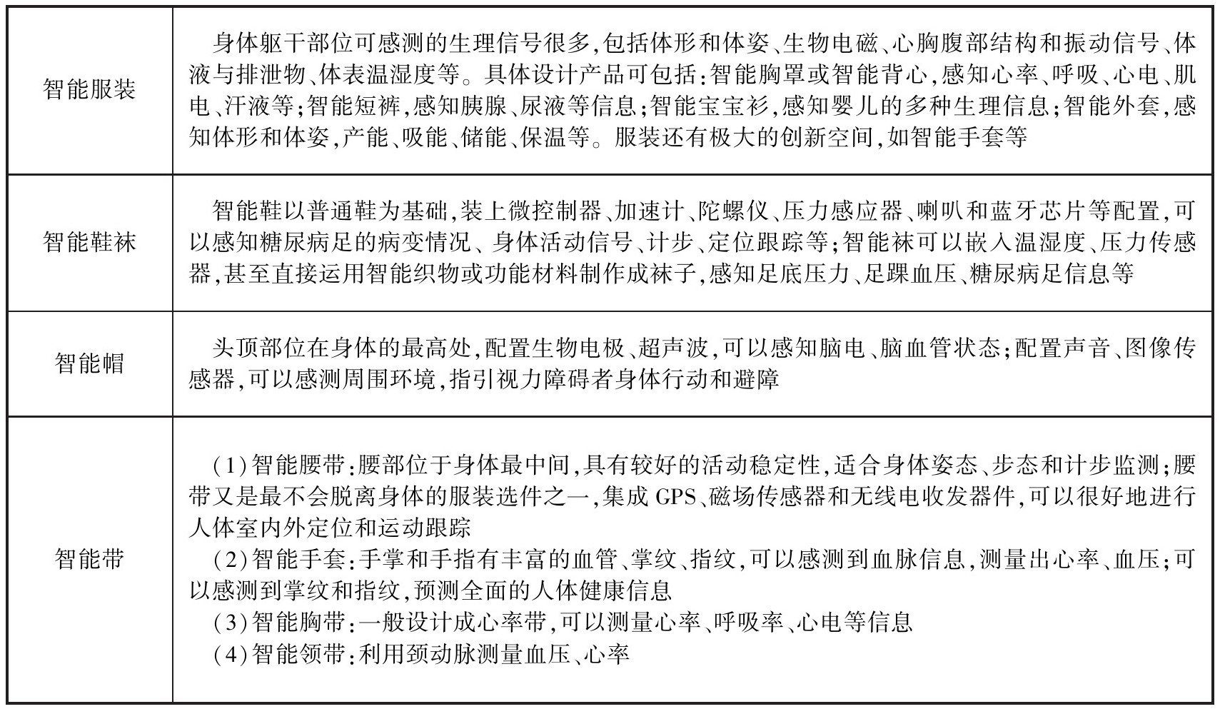 目前,可穿戴设备的形态对于人体来说,从头到脚几乎全部覆盖。如以头颈部为支撑的头盔、头带、眼镜、耳机、项链、项圈;以手部为支撑的手套、手表、手环、腕带、戒指;以脚部为支撑的鞋袜和其他佩戴饰品。除此之外,还包括服装、背包、钱夹、拐杖、配饰等,甚至还涉及医疗健康领域中许多植入人体内部的微型传感设备,以及能提升人体负重能力的机械骨架等。主要类型见表1-3-1~表1-3-3。