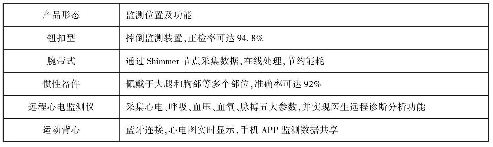 随着我国人民生活水平的提高,以及人口老龄化速度的不断加快,老年人作为相对弱势的群体,其健康状况越来越引起社会大众的关注。老年可穿戴健康监测设备如表1-3-5所示。目前国内市场面向老年人健康监测的可穿戴产品主要有:智能手表/手环、智能拐杖、3G定位吊坠、电子血压计、可穿戴式智能心电图监护仪、享睡智能纽扣、智能心率服、智能调温服等。