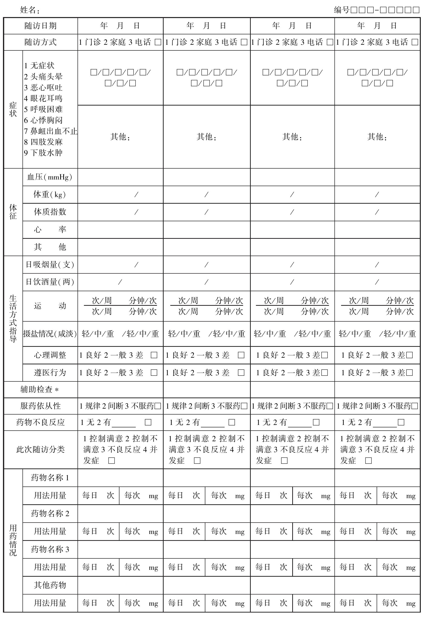 7.此次随访分类:根据此次随访时的分类结果,由随访医生在4种分类结果中选择一项在“□”中填上相应的数字。“控制满意”意为血压控制满意,无其他异常;“控制不满意”意为血压控制不满意,无其他异常;“不良反应”意为存在药物不良反应;“并发症”意为出现新的并发症或并发症出现异常。如果患者同时出现几种情况,填写最严重的一种情况,同时结合上次随访情况确定患者下次随访时间,并告知患者。