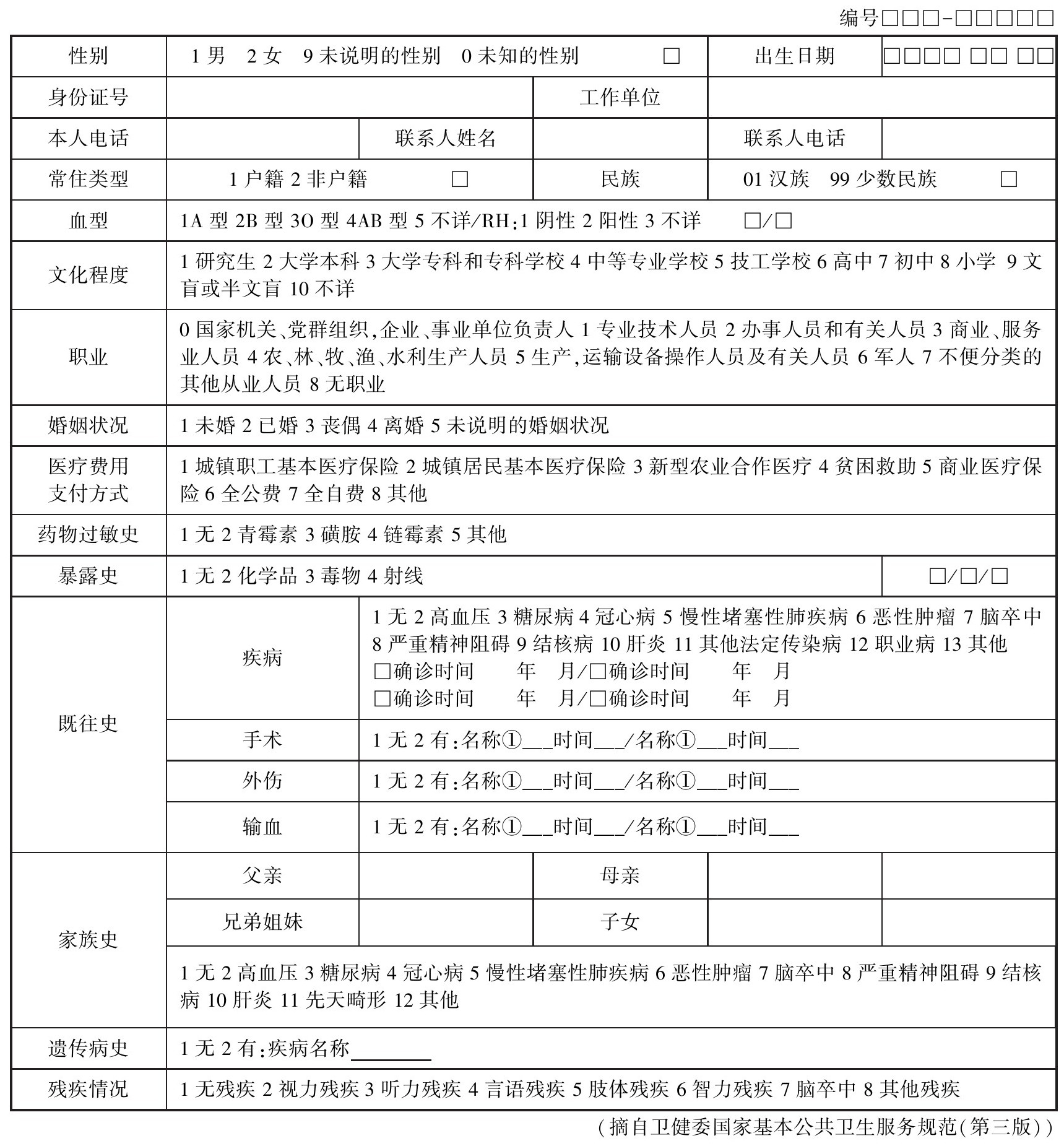 ②在各种记录表中,凡有备选答案的项目,应在该项目栏的“□”内填写与相应答案选项编号对应的数字,如性别为男,应在性别栏“□”内填写与“1男”对应的数字1。对于选择备选答案中“其他”或者“异常”这一选项者,应在该选项留出的空白处用文字填写相应内容,并在项目栏的“□”内填写与“其他”或者“异常”选项编号对应的数字。对各类表单中没有备选答案的项目,用文字或数据在相应的横线上或方框内据实填写。