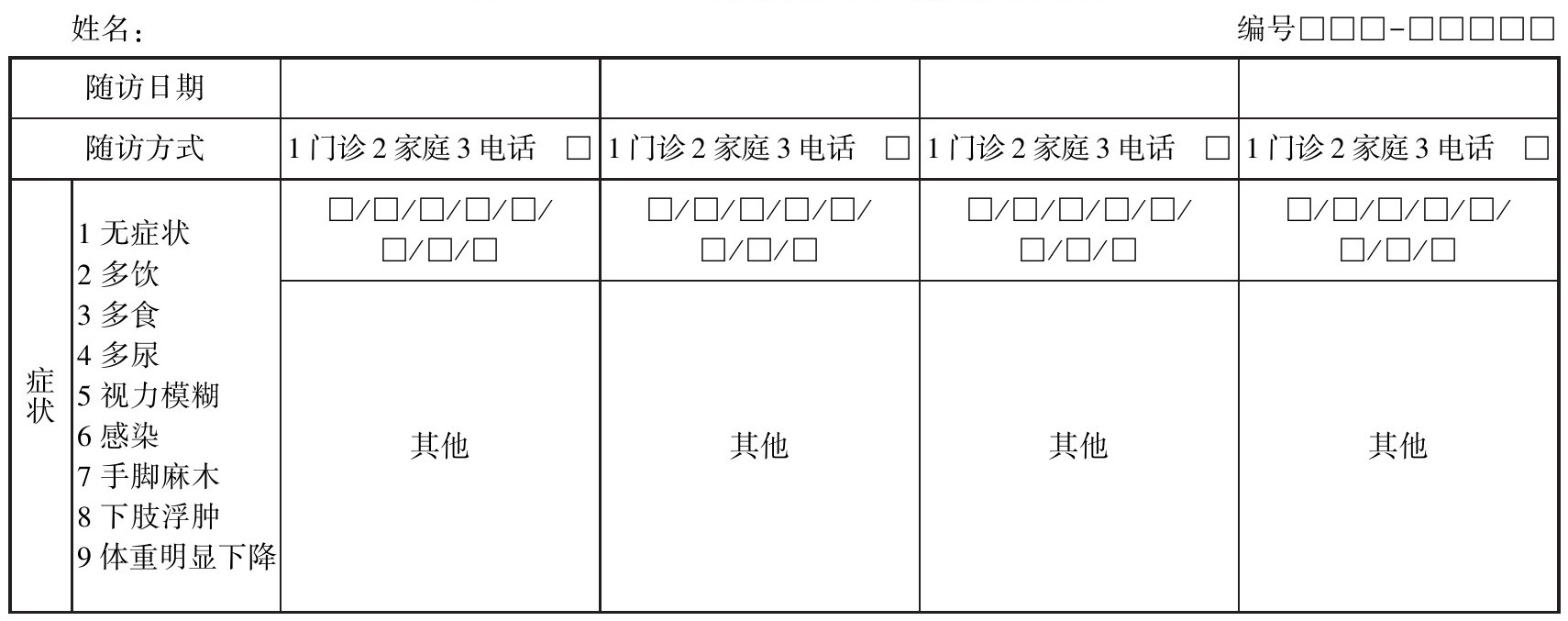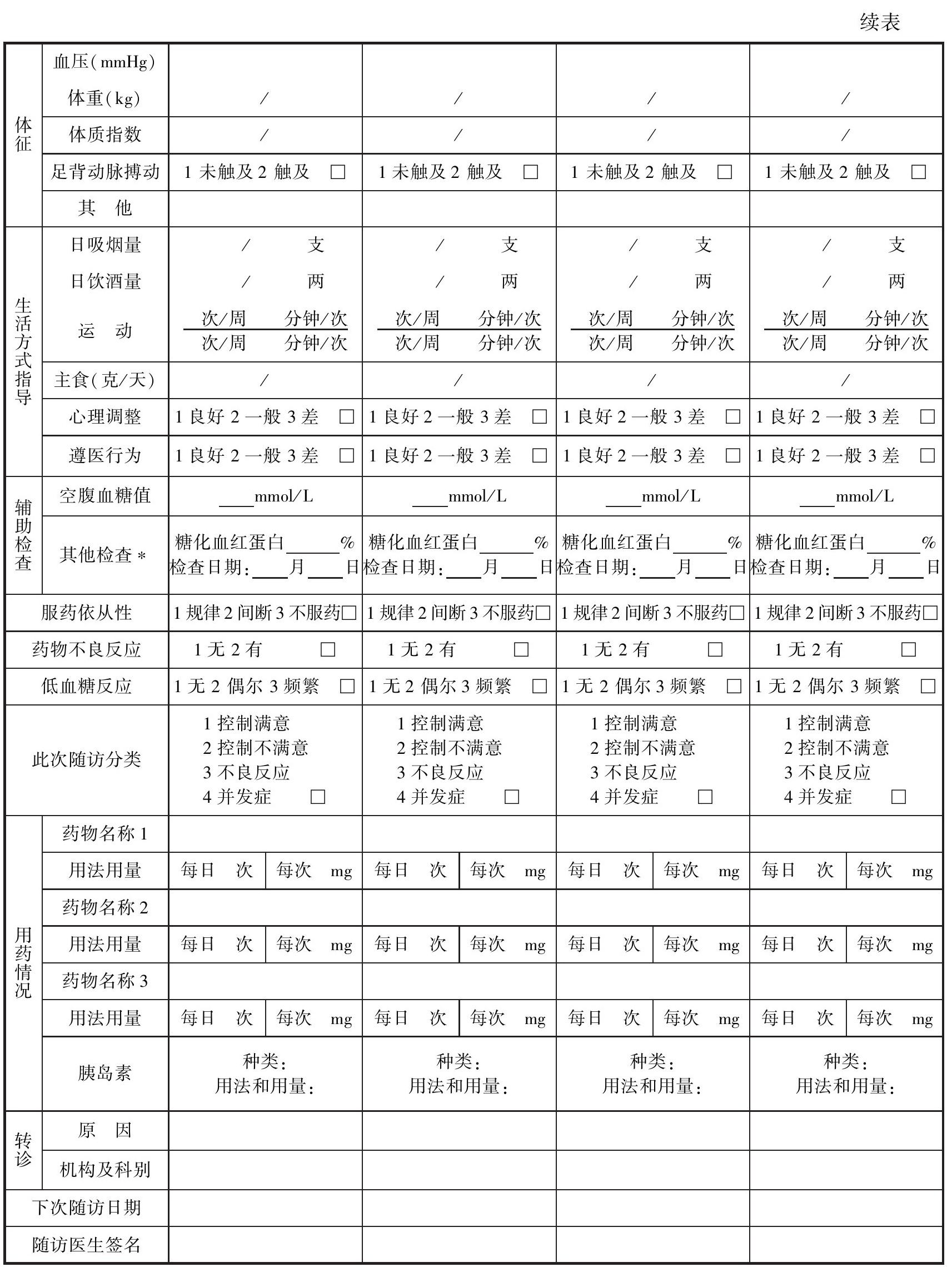 8.此次随访分类:根据此次随访时的分类结果,由责任医生在4种分类结果中选择一项在“□”中填上相应的数字。“控制满意”意为血糖控制满意,无其他异常;“控制不满意”意为血糖控制不满意,无其他异常;“不良反应”意为存在药物不良反应;“并发症”意为出现新的并发症或并发症出现异常。如果患者同时出现几种情况,填写最严重的一种情况,同时结合上次随访情况确定患者下次随访时间,并告知患者。