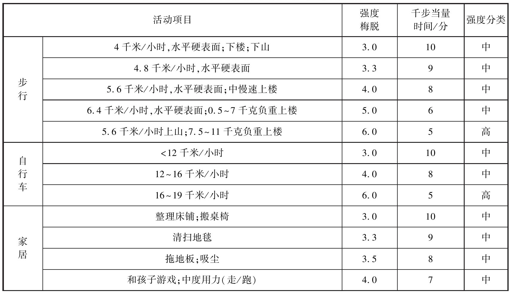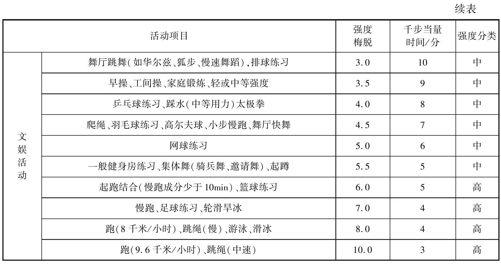 指相对于安静休息时身体活动的能量代谢水平,1METs相当于每分钟每千克体重消耗3.5mL的氧,或每千克体重每小时消耗1.05kcal能量的活动强度。≥6METs为高强度活动;3~5.9METs为中等强度活动;1.6~2.9METs为低强度活动;1.0~1.5METs为坐、躺姿势阅读、看电视或使用手机、电脑等电子产品等静态行为活动。各类身体活动的梅脱值可查阅有关数据库(表2-3-1)。