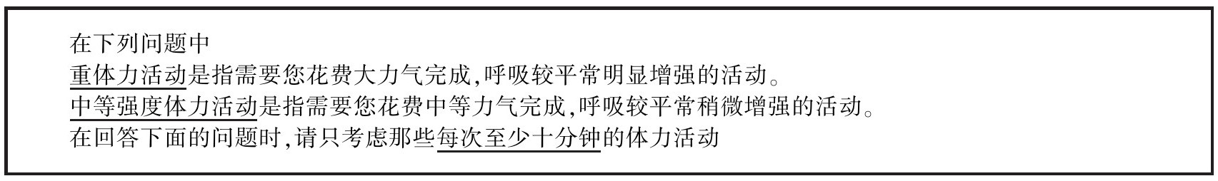 ②日志记录:以日志的形式记录一天中各种体力活动的情况和时间,可以较为准确地掌握总的体力活动水平,如以15min为一段,逐段记录所从事的活动。对于不同活动强度的定义通常需要举例说明,对某些活动需要区分不同的成分,如采摘棉花劳动中包含来往于棉田的路程、采摘、汇集、打包、中间休息等多种活动形式,球类活动中也存在跑动、站立、跳跃、替补、暂停、休息等多种活动形式,综合不同活动形式的强度时间才能准确反映实际的体力活动量。