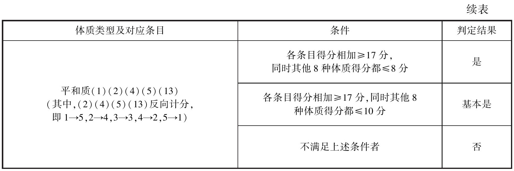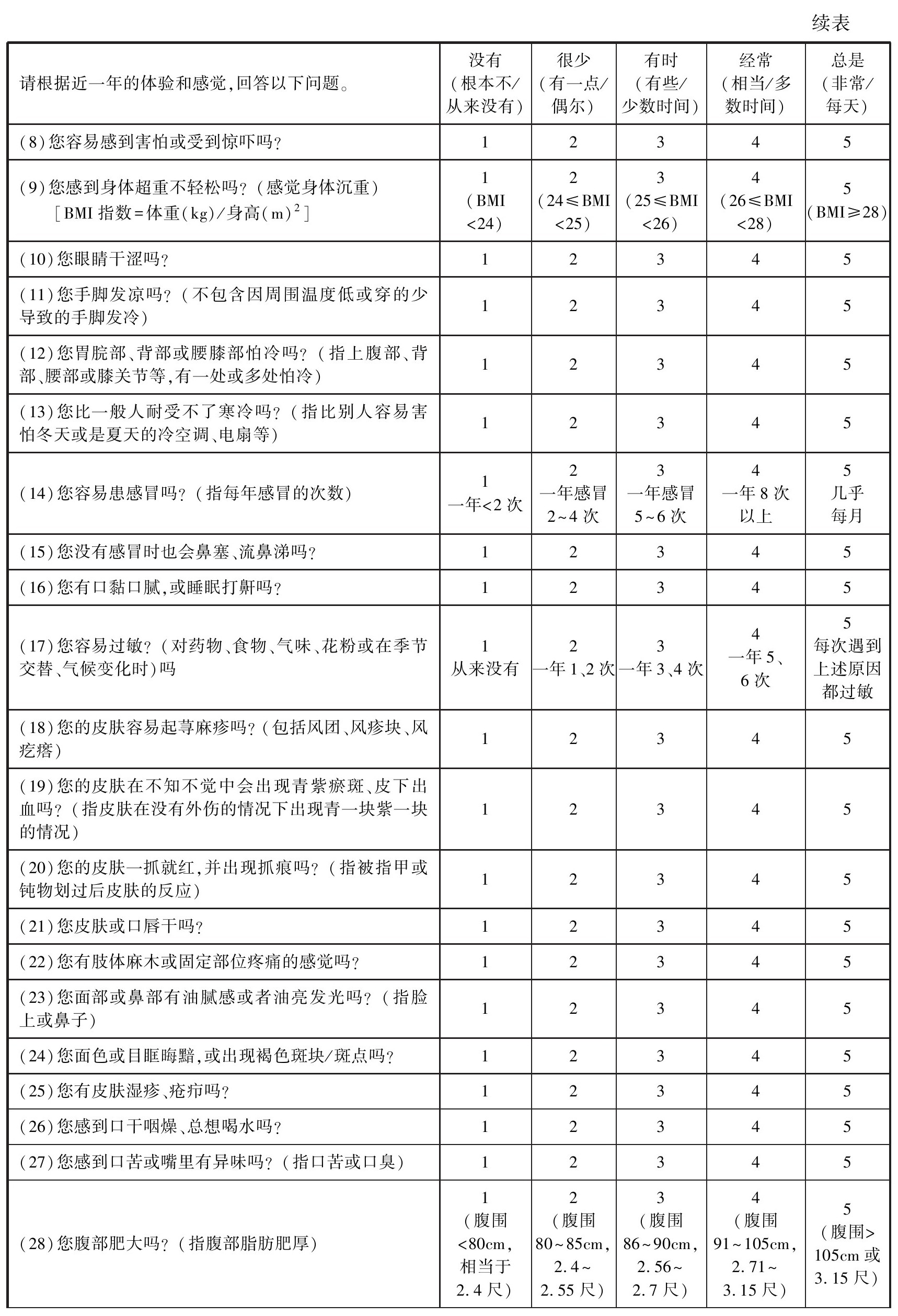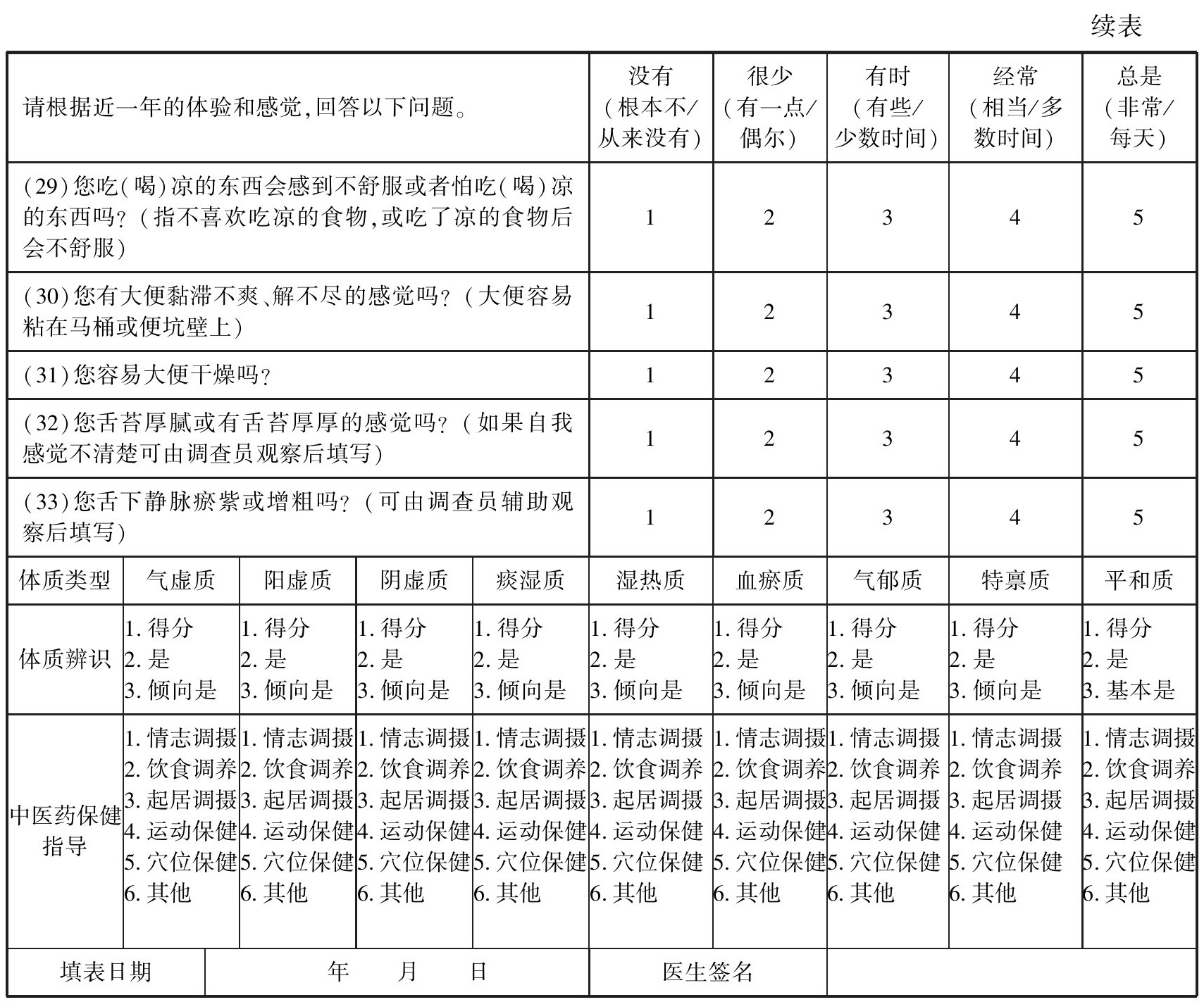 5.体质辨识:医务人员应根据体质判定标准表(附件2)进行辨识结果判定,偏颇体质为“是”“倾向是”,平和体质为“是”“基本是”,并在相应选项上划“√”。