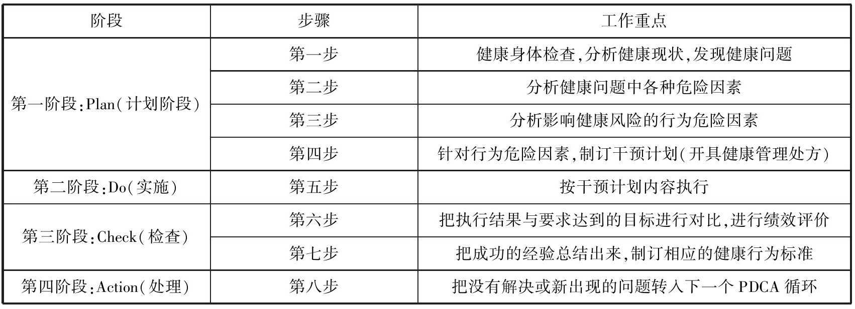 健康管理的行业本质就是“管理”两字。何谓“管理”?管理是一个计划以及为达成计划所实施的一切活动的全体。管理是一个不断循环的过程,根据管理是一个过程的理论,世界著名质量管理专家戴明博士在20世纪50年代就基于全面质量管理理论提出了PDCA循环方法(简称“戴明环”),JCIA(国际医疗机构认证联合委员会医院管理标准)已将PDCA循环推荐为医院质量改进方案。PDCA是英语单词Plan(计划)、Do(执行)、Check(检查)和Action(处理)的首字母,PDCA循环就是按照这样的顺序进行质量管理,并且循环不止地进行下去的科学程序。这套管理方法在用于帮助个人进行行为改变上作用显著。健康管理PDCA循环可以分为四个阶段、八个步骤实施(表4-2-1)。