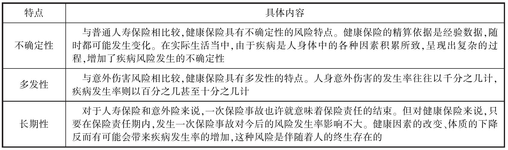 健康保险的风险除了有风险理论上的一般特征:如风险存在的客观性、风险存在的普遍性、风险存在的社会性、某一风险发生的偶然性、大量风险发生的必然性、风险的可变性外,还具有如下特点(表5-2-3)。