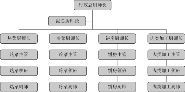 大型的西餐厨房一般都由若干个功能的厨房组合而成,常见于酒店等餐饮企业,主要由一名行政总厨师长负责厨房的全面管理工作,一名副总厨师长协助行政总厨师长管理工作,同时设立多名厨师长负责不同功能厨房的管理工作,如图2-1-2所示。