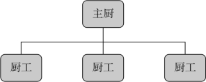 小型的西餐厨房常见于咖啡厅、西式快餐厅等提供西餐快餐或简餐的餐厅,主要特点是菜肴的加工与管理等工作由一名主厨负责,组织结构比较简单,如图2-1-1所示。