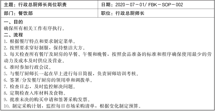 (1)行政总厨师长(Executive chef)——在上级(如餐饮总监)的领导下,全面负责厨房的组织、指挥和运转管理工作。