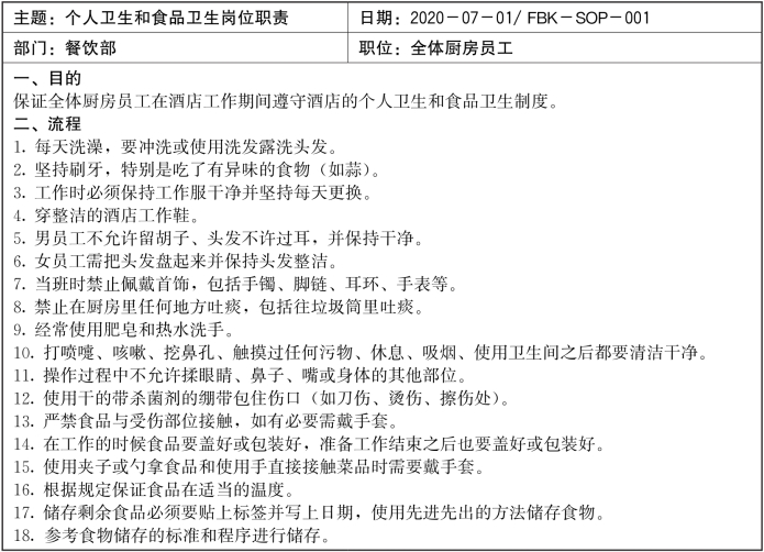 厨房岗位职责案例如表2-2-1和表2-2-2所示。