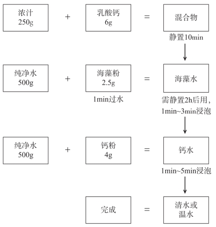②制作海藻粉混合物时,如需要调节汁酱的酸碱度和浓度,可分别通过加入柠檬酸钠和黄原胶进行调节。
