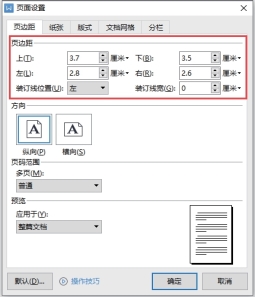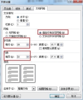 页面布局—页边距—自定义页边距。【页边距】“上3.7cm,下3.5cm,左2.8cm,右2.6cm”,【纸张】“A4纸”,【版式】“奇偶页不同”,【字体设置】“中文字体方正仿宋GBK三号,英文字体TimesNewRoman三号”,【指定行和字符网格】“每行28字符,每页22行”,最后点击【确定】,如图4.1至图4.4所示。
