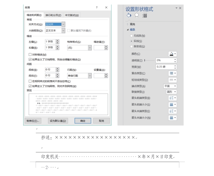 插入—形状—直线。按住Ctrl+Shift键,同时用鼠标左键点击复印3条直线,分别为上中下直线,设置形状格式颜色均为黑色,上下宽度为0.35磅,中间为0.25磅,水平居中并对齐直角。需满足上中线能自动空行条件,才算合格,办公软件Office Word 2016有自动调整功能,其他办公软件需用计算机键盘上下左右键调整。抄送、印发机关左空一字排列,印发日期右空一字排列。如无抄送请删除上横线。版记位于偶数页底部。版记部分中文字用方正仿宋GBK四号,数字用阿拉伯数字Times New Roman四号,如图4.9所示。