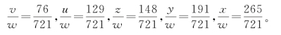 其中x,y,z,u,v代表五家绠长,w代表井深。用消元法求得各家绠长与井深之比: