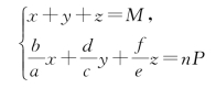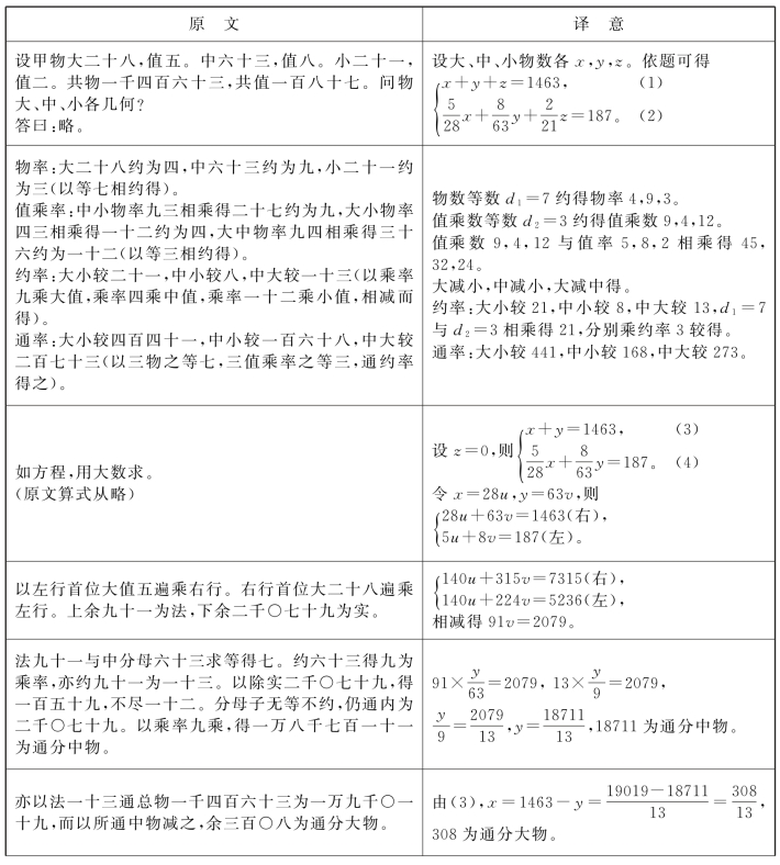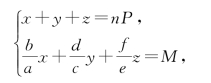 的三元一次不定方程组,其中,a,c,e分别是大物、中物、小物的物数,b,d,f分别是其相应的值钱数,M为共物,nP为共值,a,c,e,b,d,f,M,nP皆为正整数,且。相应的下题,值钱数相同,物数不同,具有如下形式: