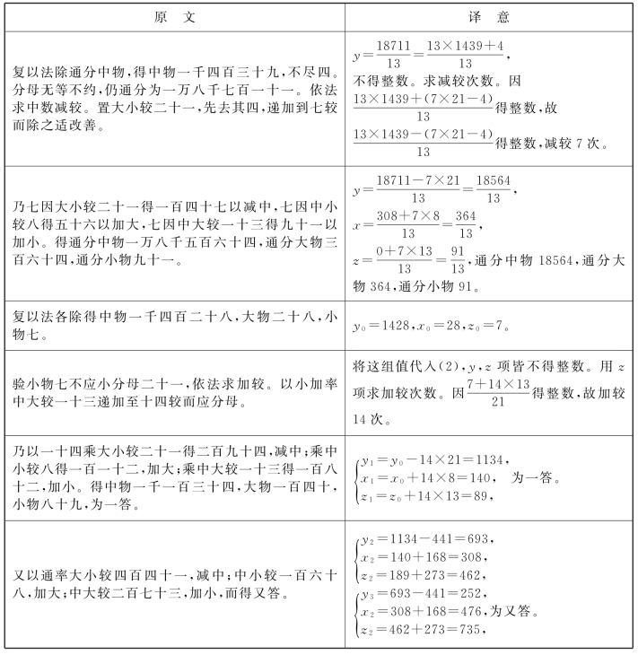 然后以x=1,2,…诸数试算,得x=5时,y为正整数。显然,在这一情况,两者是一样的,都是先化得一个形如ax+by=c的不定方程,所不同者,骆腾凤是用大衍求一术来解此不定方程,而时曰醇则用试算的方法来求解。可见,丁、时法要真正成为通解,还必须求助于大衍求一术。