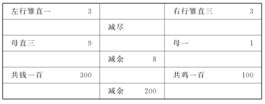 如方程,用鸡雏求,以左行首位雏直一遍乘右行,右行首位雏三遍乘左行,两两相减,上余八为法,下余二百为实。除之得二十五。以母一乘不变,即为鸡母数。以减共鸡一百,余七十五为鸡雏数,乃用翁雏较七减母,母雏较四加翁,母翁较三加雏,得鸡母一十八,鸡翁四,鸡雏七十八,为一答。以各依较数加减而得又答。