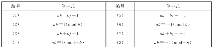 限定单一不定方程首项为正,a,b为正整数,共有ak±bj=±1的4种形式,小系数和常数1各有一组相反数。相应地,单一同余式ak≡±l(mod±b)也有4种形式,模和常数1各有一组相反数。