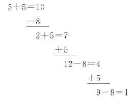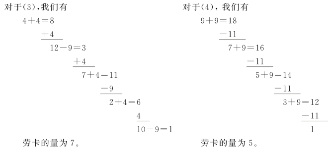 由上式可知,(2)式合计5个5,(3)式合计7个4,(4)式合计5个9。这就是作者所说计算得(2)式的“劳卡(Loca)”是5,(3)式是7,(4)式是5。作者还就上式做了解释,他以(4)式为例说:“如果取504为‘约简的数’,则余数为9。如果取其(504)两倍,则余数9也得二倍起来。因之,除以11则余7。其他仿此。”