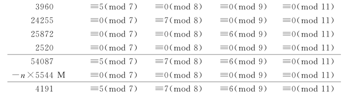 作者进一步说:“每一数除以自己的除数则余数为1,此外,可整除以其他除数。在‘约简的数’中,乘以其余数后,其余数仍然是其原来的余数。因此,每个‘约简的数’除以自己的除数则有一余数,而可整除以其他除数。所以,其和54087除以各除数时,则各有余数。”作者的这段论述用现代符号表示如下: